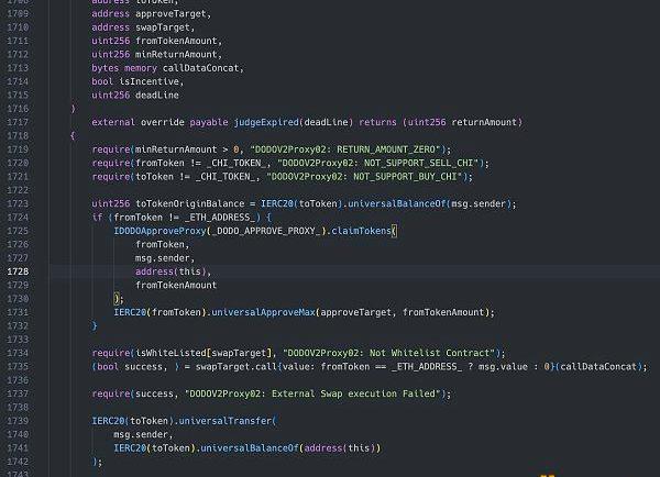 在DODOV2Proxy02合約中存在externalSwap函數,用來調用DODO聚合的外部平臺進行兌換,如0x,1inch,代碼實現如下: