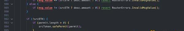 校驗了desc中的minReturnAmount后,從desc中獲取srcToken和dstToken,接下來986-997行可以通過構造desc結構體中的flags和srcToken進行繞過: