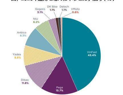 越南市場電動兩輪車企業有VinFast、Pega、Dibao、雅迪等,傳統摩托車企業本田、雅馬哈等暫未發力。2020年越南電動兩輪車銷量23.7萬輛,前五名為VinFast、Pega、Dibao、Yadea、Anbico,市占率分別為43.4%、15.7%、11.8%、8.6%、8.3%,CR5達88%。