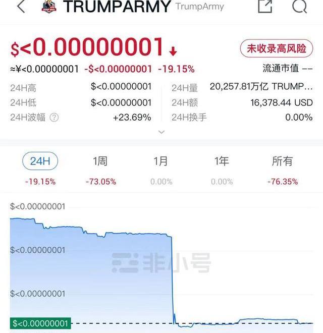 《華夏時報》記者在虛擬貨幣投資平臺發現,今年5月,有2款特朗普概念幣發售,但目前行情走勢并不樂觀。其中,一款名為“TRUMPARMY”的代幣在一周內下跌超70%,已經接近歸零。