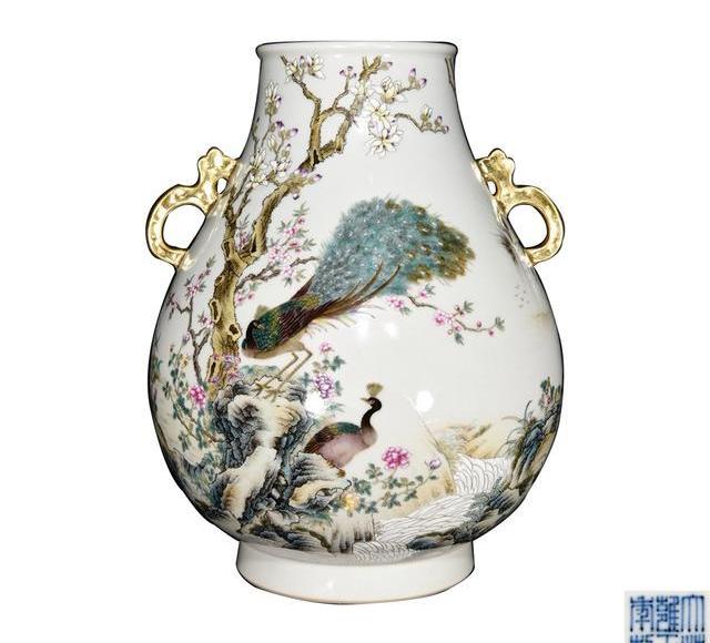 7、清雍正粉彩花鳥孔雀紋如意耳尊