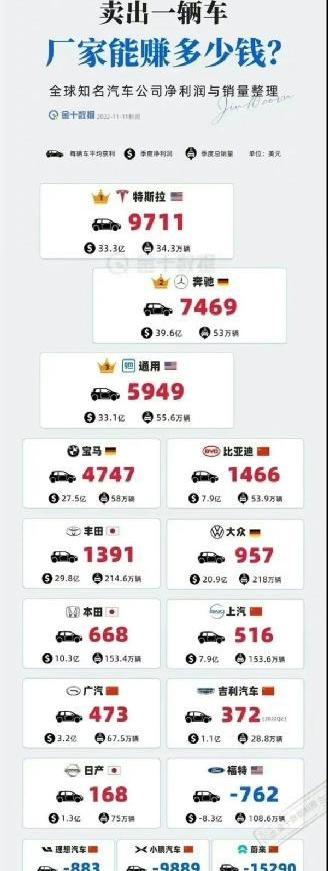 以一季度特斯拉總營收和總銷量計算,特斯拉每輛車的單車凈利潤約為1.02萬美元,比亞迪的單車凈利潤約為0.75萬元,以最新匯率計算,特斯拉的整車凈利潤約為比亞迪的9倍。以2022年全年數據來看,特斯拉2022年的車輛銷售利潤率為28.5%,比亞迪的利潤率則是3.9%左右,相比之下,特斯拉的利潤率是比亞迪的7倍有余。雖然特斯拉還有軟件等方面收入,但比亞迪同樣有電池業務的收入,以此計算或不太準確,卻也能反應兩家車企的單車利潤空間。所以特斯拉每輛車依然有數萬元降價的空間。