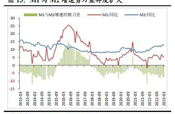 3月末M1同比增長5.1%,增速較上月回落0.7個百分點。其中,占M1的比重超過80%的單位活期存款,其增速由2月的4.9%回落至3月的4.1%,是主要拖累因素,同期M0增速較上月還提高0.4個百分點至11%。單位活期存款增速較上月回落或主要與企業盈利下降,導致現金流短期內偏緊相關。如1-2月份全國規模以上工業企業利潤總額同比下降22.9%,預計3月份在PPI降幅擴大等因素拖累下大概率維持負增長,企業盈利承壓導致現金流恢復仍偏弱。往后看,房地產政策加碼和經濟恢復有利于M1增速回升,如歷史上房地產市場景氣度與M1增速走勢較為一致;但出口負增長、PPI降幅擴大、企業繼續去庫存,拖累企業盈利仍在筑底,未來M1增速回升幅度和速度仍待觀察。