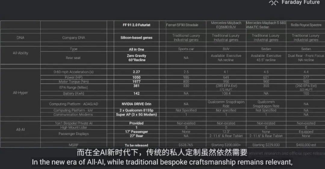 所以,在我們看來,FF91在海外市場或許會取得相對不錯的市場反饋,畢竟像它們例舉的梅賽德斯奔馳EQSSUV、梅賽德斯邁巴赫S、法拉利SF90Stradale和勞斯萊斯閃靈,無論是性能,還是硬件,又或者是娛樂屏幕大小上,都略輸一籌。