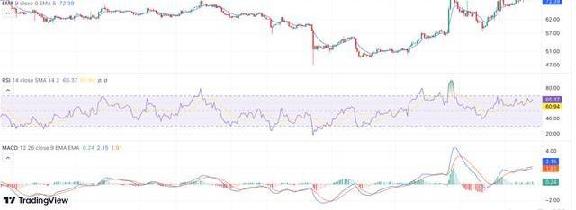 MACD也在穩步上升,表明市場看漲壓力加大,柱狀圖也呈正值,表明牛市可能即將到來。MACD線也處于信號線上方,表明近期可能進一步上漲。RSI指標目前位于65.37,仍處于中性,但看漲壓力繼續增強。20日均線目前高于50日均線和200日均線,表明近期將進一步上漲。
