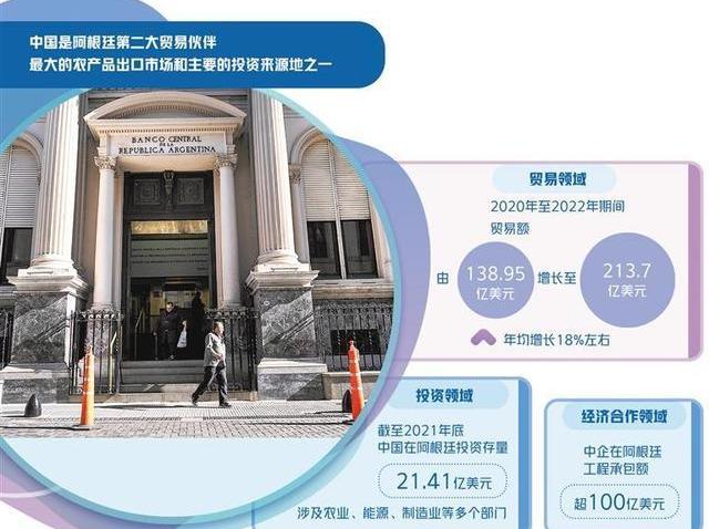 阿根廷之所以會選擇人民幣,重要基礎之一是中拉經貿合作的健康發展。近年來,阿根廷對華貿易、投資、金融與經濟合作規模均處于拉美相對領先地位。中國是阿根廷第二大貿易伙伴、最大的農產品出口市場和主要的投資來源地之一。在貿易領域,2020年至2022年期間,中阿貿易額由138.95億美元增長至213.7億美元,年均增長18%左右。其中,阿超過80%的大豆銷往中國,牛肉、海鮮和貝類、動物油脂、飲料、皮革等產品也成為出口中國的主力產品。在投資領域,截至2021年底,中國在阿投資存量達21.41億美元,涉及農業、能源、制造業等多個部門。在金融合作領域,中方已為阿提供各類融資上百億美元,有力支持了阿能源、交通、通訊等重大基礎設施項目建設。在經濟合作領域,中企參與阿根廷多個基建和能源項目,在阿工程承包額超過100億美元,超出在多數拉美國家的合作規模。