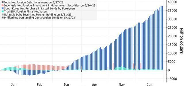 2.今年以來,全球投資者一直在韓國債券上加倉,5月和6月的購買速度加快,達到230多億美元。根據彭博追蹤的數據,今年到目前為止,他們已經向這些債券注入了370億美元,是亞洲債券市場上最多的。