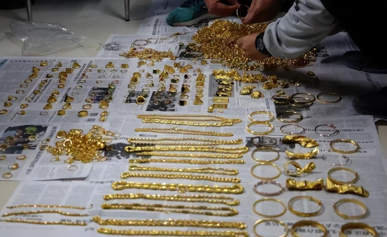 里面不是什么磚塊,而是滿滿一箱金子,里面有金項鏈、金手鐲、金戒指、金扣子等。