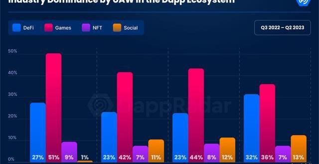 游戲繼續占據Dapp領域的主導地位,市場份額占比達到37%,但與上一季度45%的市場主導地位相比有所下降。值得注意的是,在Memecoin熱潮和L2空投的推動下,DeFi重新崛起,其市場主導地位占比從23%升至32%,出現了人氣回升的跡象。此外,社交類Dapp市場主導地位占比也逐漸上漲,二季度占比約為13%,比上一季度增加了1%。相比之下,NFT行業的增長軌跡似乎正在放緩,主導地位降至7%,這一數字與2022年第四季度的水平相當。