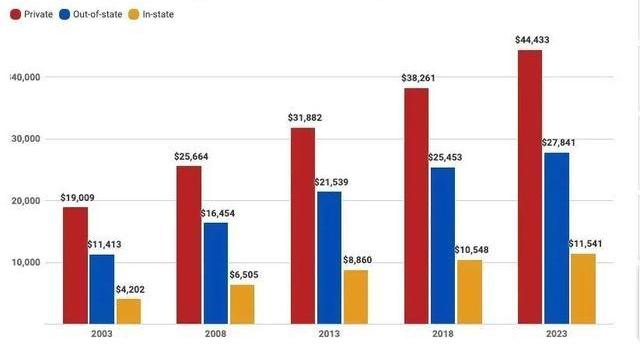 最近,U.S.News統計了從2002年到2022年二十年間,美國私立大學和公立大學的學費變化。