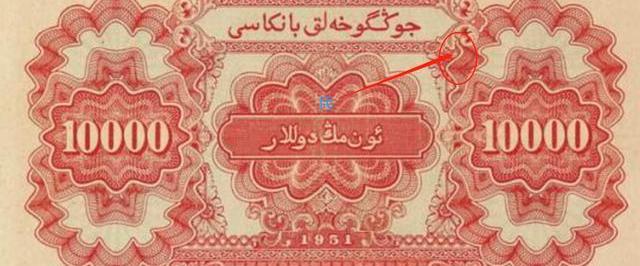 “壹萬圓駱駝隊”版背面主色調為紅色,由于“壹萬圓駱駝隊”版在新疆地區發行,因此背面印有維文。維文結合行名和面值、幾何圖形、花卷形成了該版本的背面圖案。另外在背面右上角行名右側還存在一特殊暗記,“民”字暗記便隱藏在這部分圖案之中。