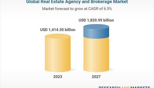 根據市場研究機構ResearchandMarkets發布的《2023年房地產代理和經紀全球市場報告》,全球房地產中介市場從2022年的1.32萬億美元增長到2023年的1.4萬億美元,復合年增長率為7.3%。盡管俄羅斯-烏克蘭戰爭短期內打亂了全球經濟從疫情中恢復的節奏,但預計到2027年,房地產中介市場將以6.5%的復合年增長率增長到1.82萬億美元。