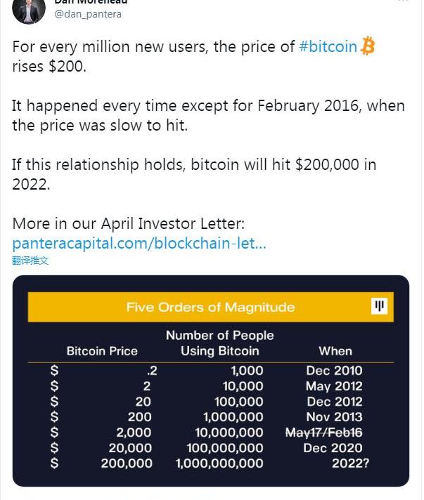 莫爾黑德還在推特上特別指出,比特幣市場每增加百萬用戶,比特幣價格就會上漲200美元。在過去的歷史記錄中,除了2016年2月以外,其他時候這一規律都得到了應驗。而根據這一規律,比特幣將會在2022年升至20萬美元。