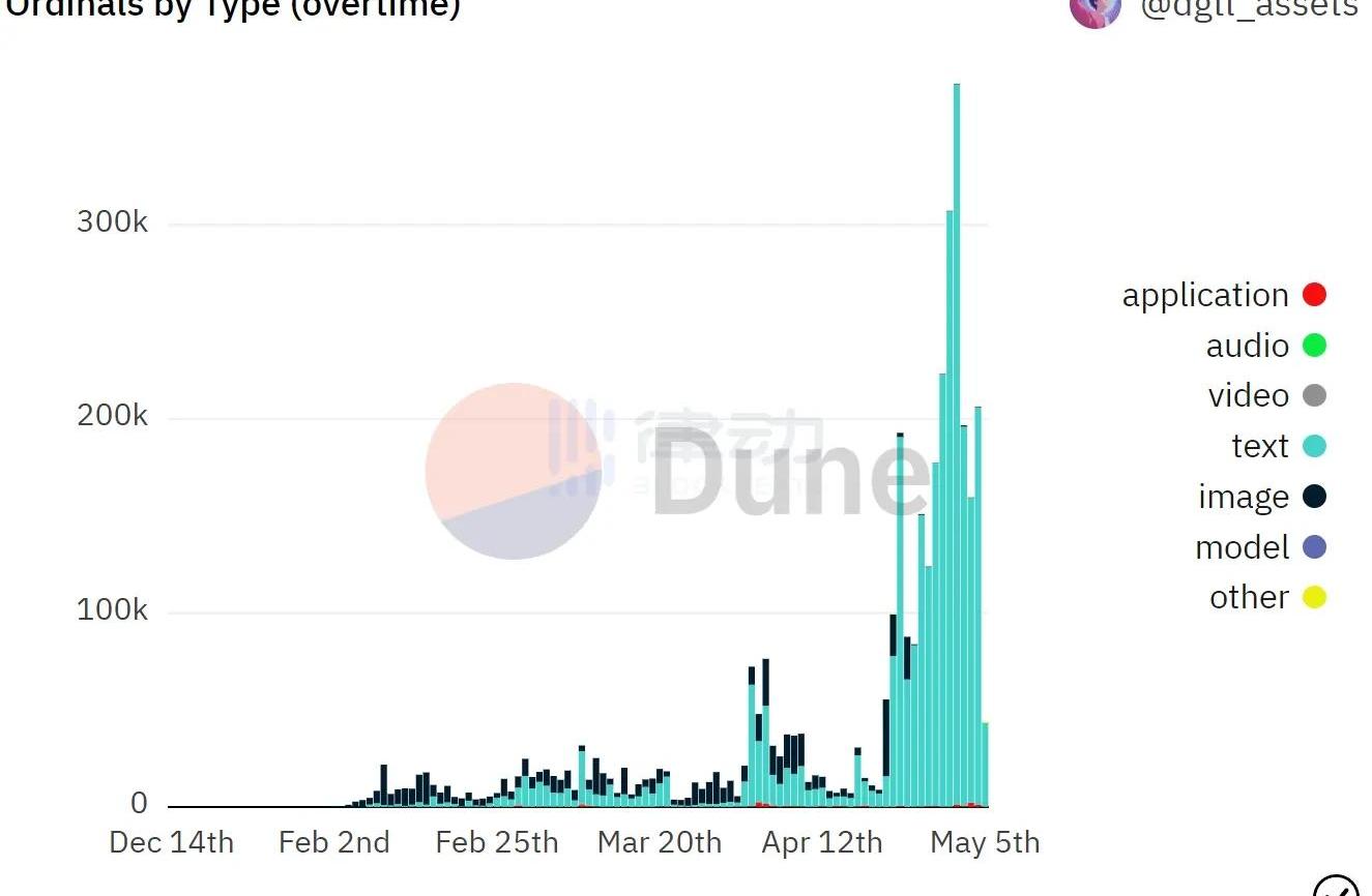 4月24日至5月3日,累計新增了181萬5157個銘文。其中,新增文本類型銘文178萬7862個,新增的圖片類型銘文僅有3122個,比特幣NFT市場可以說完全變成了BRC-20市場。然而,就在一個月前,大家的注意力還在「圖片」上。