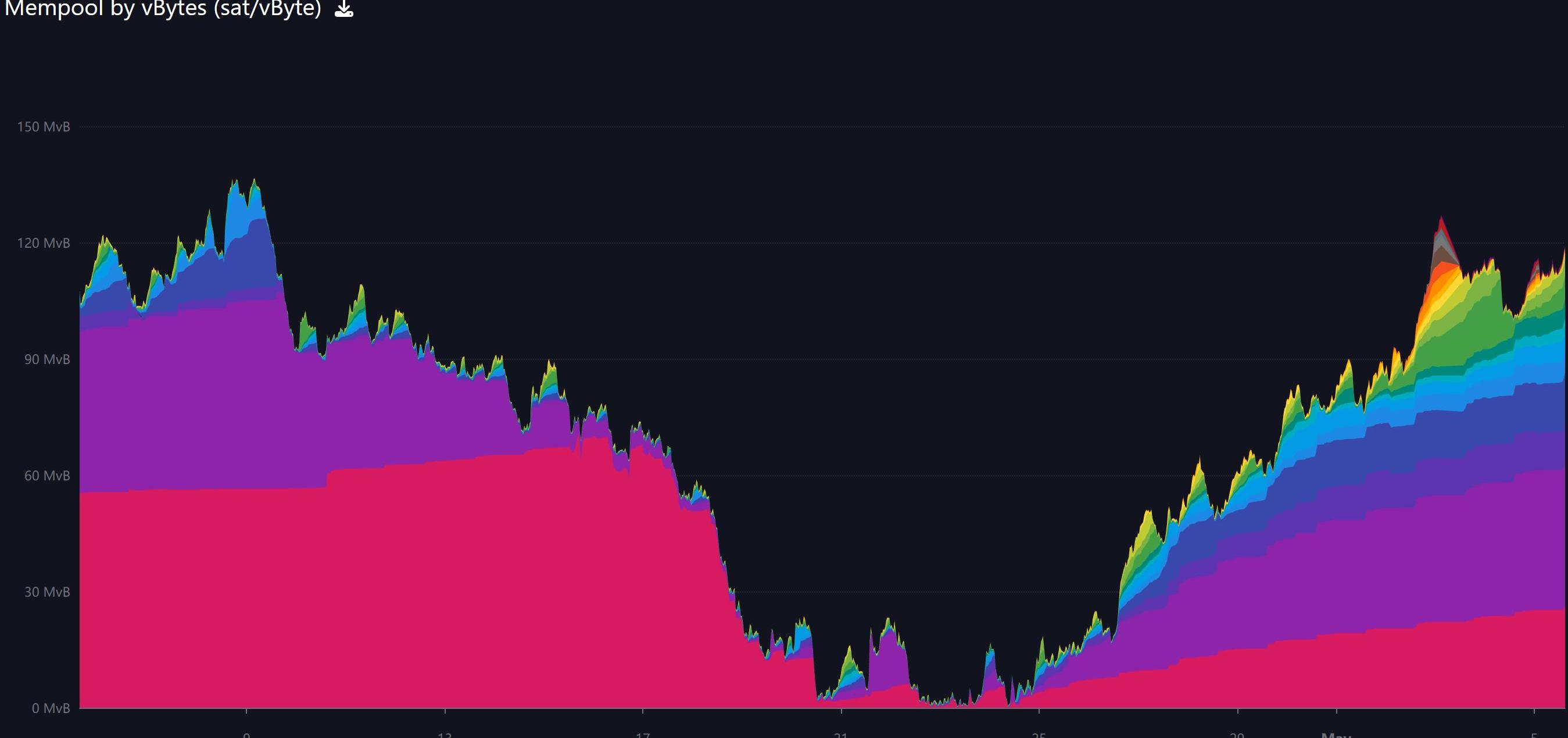 鏈上的手續費率數據也體現出了玩家們到底有多熱情。4月20日之前,?1-2sat/vB的費率每日穩定占比50%以上,能到20-30sat/vB的費率已經很「卡」了。但是近幾天,我們甚至看到了有著一定占比的100-125sat/vB費率。