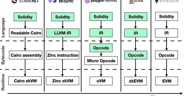 一種是擁有自己的語言和虛擬機的?ZkRollup?平臺,例如?Starkware?的?StarkNET、MatterLabs?的?ZkEVM、Polygon?的?PolygonZkEVM,這些平臺會使用編譯器將其本機語言轉換為可在?ZkEVM?虛擬機上執行的語言。這種解決方案有著不兼容的局限性。