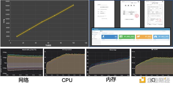本次測試環境為部署在全國10個不同城市的機房中的100個公有云節點,每個節點之間均通過固定上限帶寬的公網通信。公有云虛擬機的配置為雙核、4GB內存、20Mbps(2.5MB/s)網絡帶寬、設備硬件配置及網絡環境更加接近實際應用場景生產環境。測試結果顯示北大數瑞分布式賬本系統在公網環境、100節點規模下的存證性能可超過16萬TPS;而且隨著節點數目的增加,整個網絡的吞吐率呈現線性增加趨勢,實測效果可以更好滿足大數據、工業互聯網、物聯網等高并發場景的實際需求。