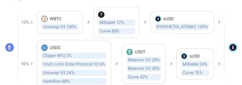 但事實上,sBTC、sETH的流動性并不高,截至發文時僅有782萬美元與1760萬美元的總價值。當使用1inch將1000枚以太坊交易為sUSD時,也僅僅有小部分是通過原子交換進行的。