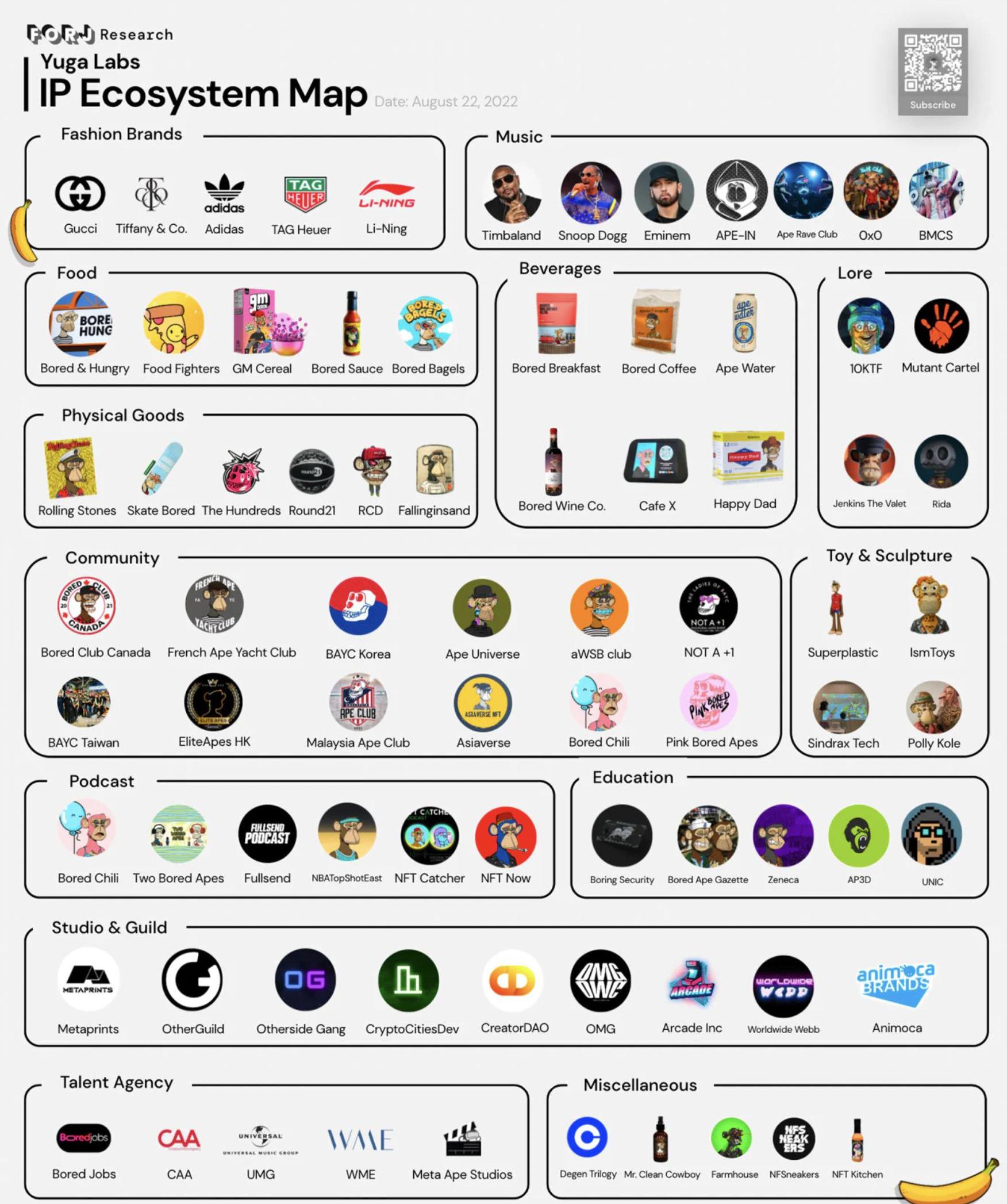 ForjCEOHarryLiu撰寫的《YugaLabs的IP帝國:近80個品牌、創作者、項目與藝術家》一文對這80個IP做了介紹非常全面,感興趣的朋友可以直接閱讀,此處不再贅述。