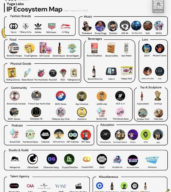 下面是@Harry_forj整理的BAYC社區IP地圖,可以看到BAYC的IP授權已經多點開花。BAYC的IP從Web3延伸到Web2市場,試圖將所有人們Ape化。