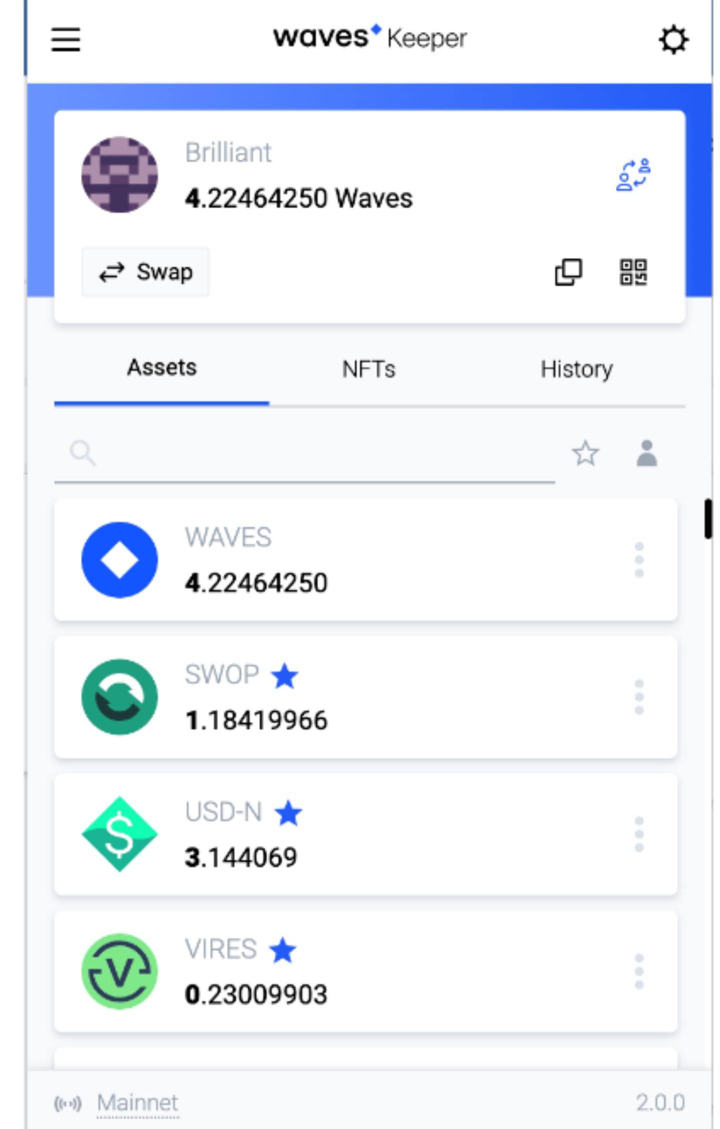 用戶可以通過WavesKeeper查看賬戶資產和NFT,可以在WavesKeeper界面中進行資金轉賬,并且可以直接通過與Swop.fi集成的WavesKeeper進行資產交換。