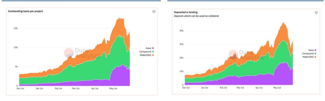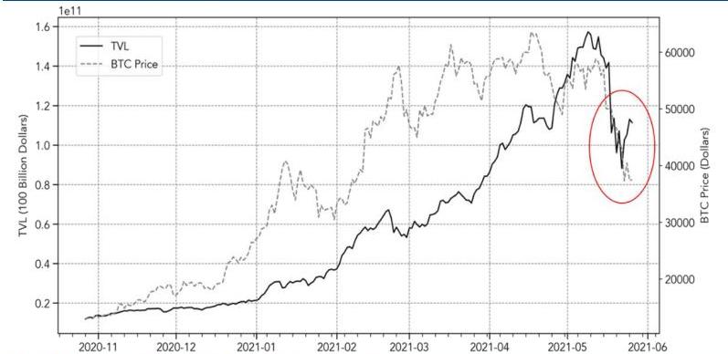將近半年BTC價格和DeFi整體鎖倉量的數據相對比,兩者相關性很高,可以大致推算出系統的抵押物數量基本穩定。從2020年11月至2021年4月中旬,BTC的價格持續上漲且較DeFi整體資產鎖倉量的增速更快,可見BTC價格在此階段更強勢。4月中旬開始,兩者走勢雖然趨同但DeFi表現出了更強的態勢。5月下旬BTC價格跌幅加劇的時候,DeFi整體鎖倉量并沒有跌更多,甚至在5月19日后表現出了一些反彈——與BTC價格走勢出現了背離。在大部分代幣跌幅超過比特幣的情況下,加之市場面臨的短期清算壓力,而DeFi生態的TVL走勢稍強于比特幣走勢,由此可見DeFi生態中鎖倉資產的留存率較高。