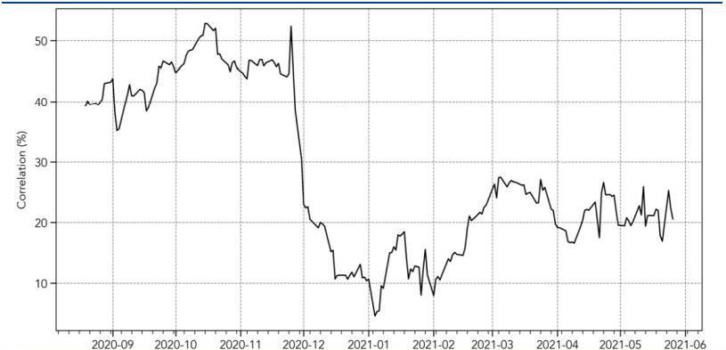 實際上,比特幣目前與美元資產的相關性并不強。自2020以來,由于全球新冠疫情的影響,美聯儲于去年調低了利率水平至歷史低位,同時輔以貨幣增發來抗擊新冠給經濟所帶來的影響。從下圖中我們也可以看到,虛線所代表的美國十年期國債利率于2020年8月處于最低位,達到了0.5%左右。而隨著新冠疫苗的大力推進和經濟的復蘇逐漸,利率水平也逐漸恢復至疫情前正常水平。通常我們能夠發現,美國中長期國債利率與資本市場走勢呈相反態勢,即國債利率漲,股票市場收益率降低。造成這一現象的原因是因為如果美國債利率上漲,按照DCF模型,那么勢必要影響資本市場的定價,導致權益市場整體收益率降低。在下圖中,我們并不能發現上述反向的關系,甚至比特幣走勢在2021年五月前與美國債利率呈現正相關的走勢。這也說明了,比特幣的價格波動實際并沒有過多地受到宏觀經濟政策及大盤的影響。