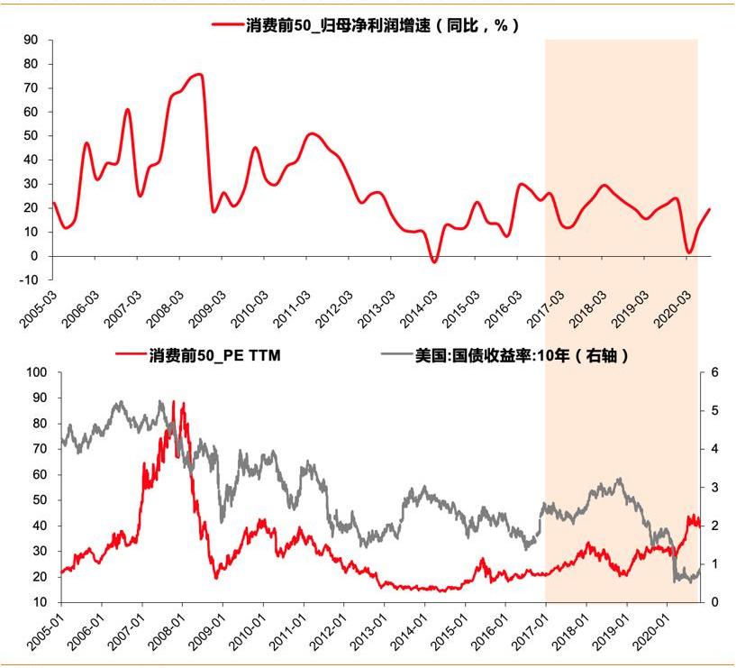 但與此同時,天風證券注意到,自2017年外資流入開始,A股核心公司的估值邏輯已經有所變遷:核心消費公司的估值與美債收益率的反向相關性極強,而與短期業績關聯度明顯下降。