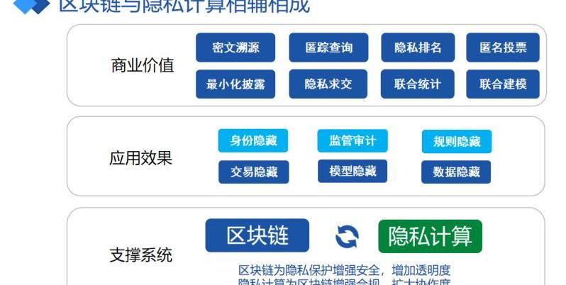 區塊鏈可以為隱私保護增強它的安全和透明度,隱私計算為區塊鏈增強合規,擴大協作度,從而非常好地去挖掘在分布式場景下的數據要素的價值。
