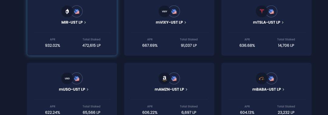 如今,投資者可以用USDT換成Terra穩定幣,然后分別在Terraswap或Uniswap上提供流動性,抵押LP,獲得MIR。