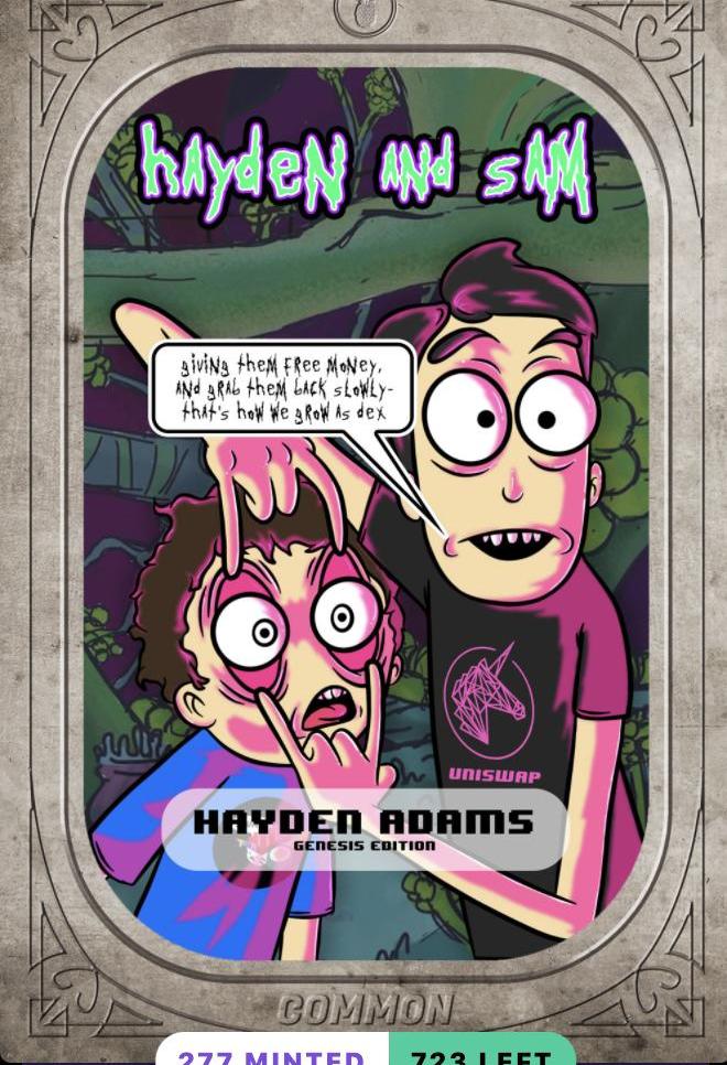 這三張是新出的Uniswap創始人HaydenAdams系列,左中右分別是普通、稀有、傳奇卡。普通和稀有的卡面都是參考了知名動畫片RickandMorty的一個表情: