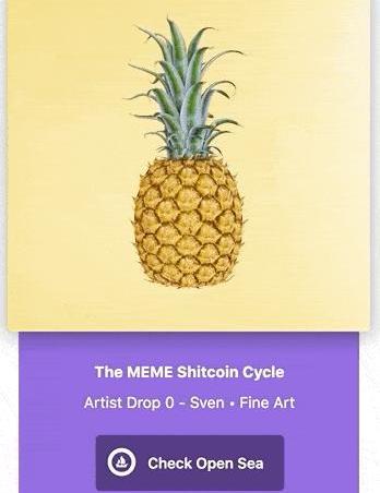 之后,MEME開了藝術家的卡池,從DEFI梗往藝術NFT領域拓展。第一期是由數字藝術家SvenEberwein創作的菠蘿為主題的一套作品,很有趣味和寓意。