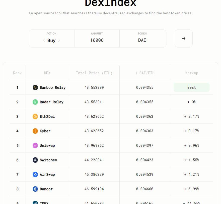 尋找各DEX中交易的最佳價格也可以通過Dexindex來查詢,以下是計劃使用DEX兌換10000DAI的最佳交易途徑。