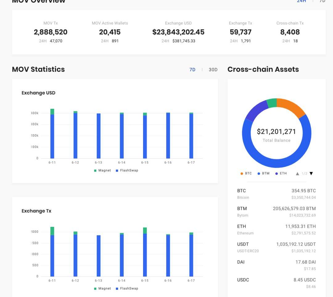MOV是一個去中心化的跨鏈價值交易協議,用戶可以通過MOV在區塊鏈上進行資產的交易和兌換,用戶可以在協議中進行掛單買賣,也可以進行一鍵兌換。根據官網的數據顯示目前跨鏈資產已超過21M美元,交易額也初具規模。