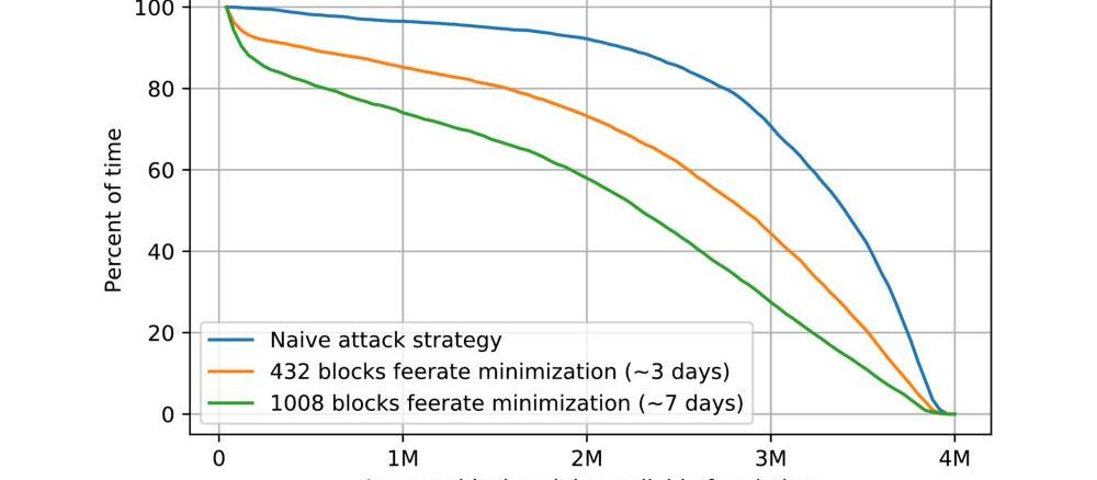 除了設置初始通道feerate之外,通道的發起人還可以在通道開放后的任何時間提出新的feerate,以將其調整為當前的區塊鏈費用狀態。閃電協議指出,在我們的情況下,另一方不允許提出任何feerate的更新請求。在“feerate-minimization”策略中,攻擊者在可能的情況下)使用費用更新機制降低通道的feerate,但從在區塊鏈費用高時進行更新。一旦通道的費用率與實際的區塊鏈費用率之間的差異變得很大,攻擊者就可以開始啟動所有HTLC付款并發起攻擊。在下圖中,我們看到了當攻擊者持續3天和7天使用feerate-minimization策略時,受害者可用的平均區塊空間。例如,當攻擊者試圖在開始攻擊前7天將費用降到最低時,受害人只有58%的時間可以使用平均一半的區塊空間,或者更多