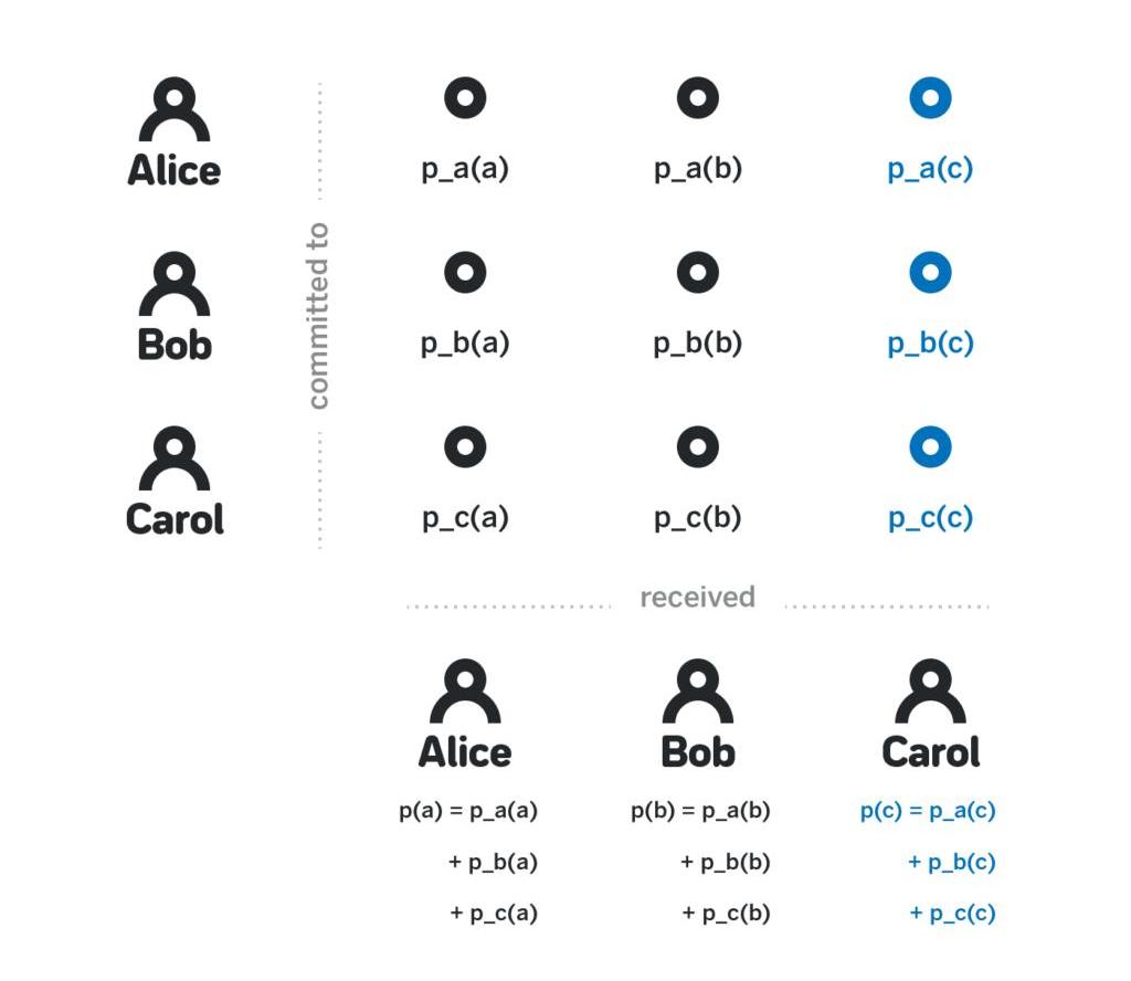 因為p(x)是每個獨立的p_i(x)的總和,每個p_i(x)都是k-1階多項式,所以要觀察p(x)是否也是k-1階多項式。其次要注意,每個參與者j只知道p(j)的值,但不知道其他p(x)的值。實際上,為了知道p(x)的值,TA需要知道所有的p_i(x),只要至少一個被承諾多項式的值屬于未知,TA就不可能知道p(x)。