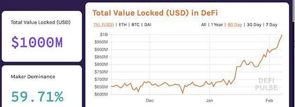 根據分析網站difipulse.com的數據,Defi市場上鎖定的10億美元,即在以太坊上構建的智能合同、協議和去中心化應用(Dapps)種,幾乎有60%是MakerDAO旗下的穩定幣DAI。