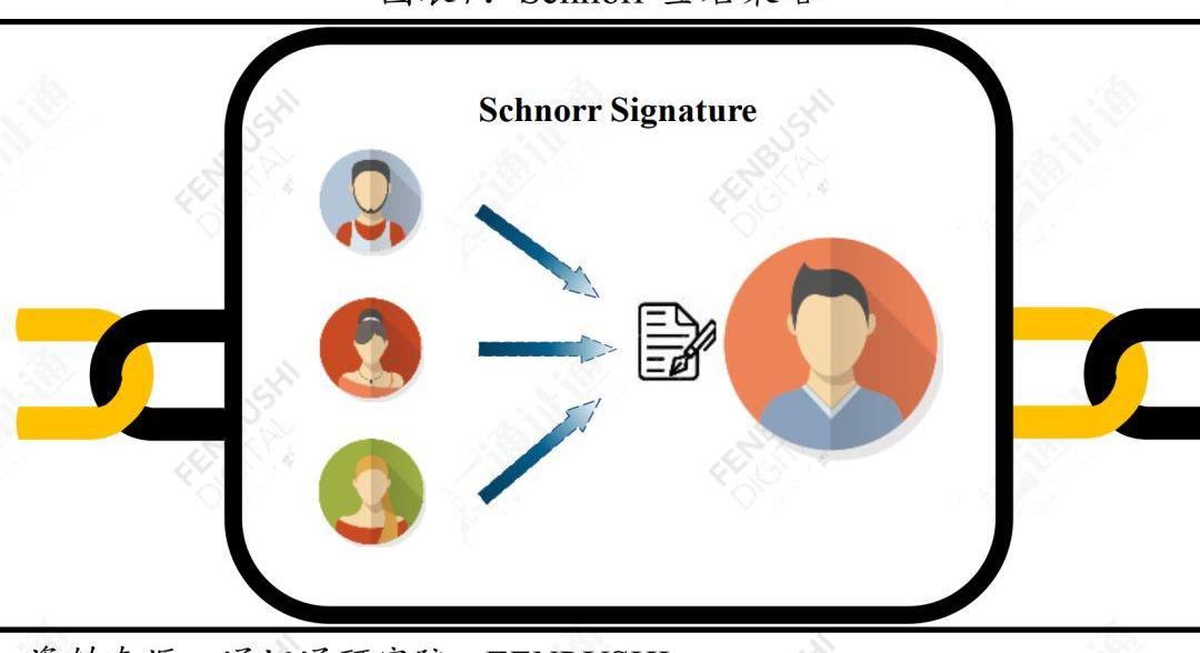 作為提升BTC區塊鏈性能的可行方案之一,Schnorr簽名與BTC已使用的橢圓曲線參數secp256k1相兼容,并且與ECDSA具有相同的安全假設,可完美替代ECDSA。Schnorr簽名的核心用途是將多個簽名聚合成一個新簽名。由于Schnorr簽名具有線性屬性,兩個或者更多的Schnorr簽名可以組合成一個新的Schnorr簽名,并且新的聚合簽名依然僅有常規簽名的大小,這樣的設計能夠使觀察者無法區分聚合多重簽名和常規簽名,從而有效提升數字通證的隱私性,同時提升區塊的交易容量。