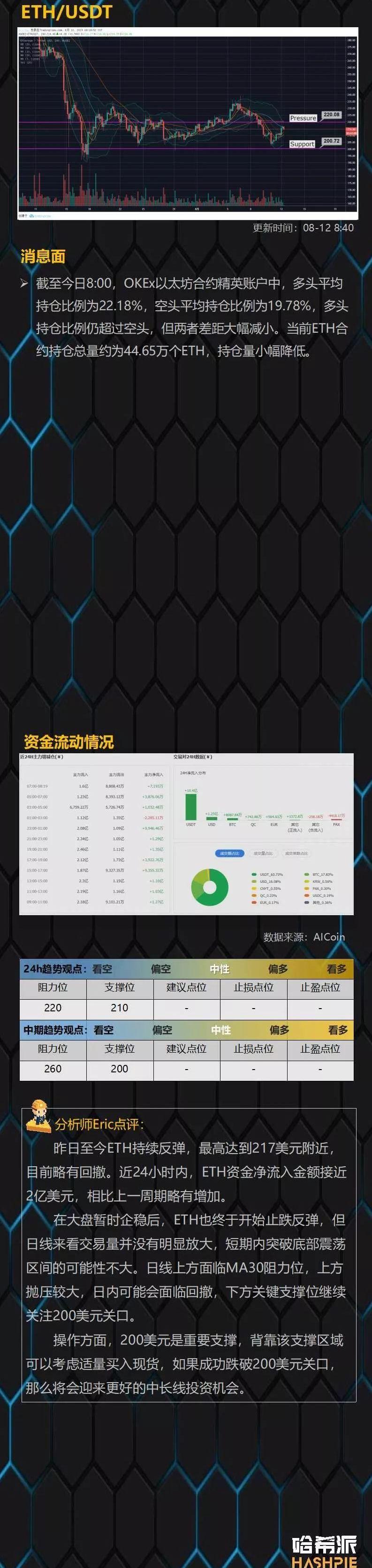 分析 | 大盤昨晚直線拉升后續怎么走?:金色財經分析師認為近期各主流幣在前日下破低點得到周線級別的重要支撐,昨日在平臺幣的帶動下開啟反彈大漲,日線反包形成,短期看漲,預計近日將逐步測試上方壓力位,若能突破大跌后的K線,則宣告調整結束,開啟新一輪趨勢行情,建議拿好手中中長線籌碼,短線可以適當低吸入場。BTC支撐3750/3700,壓力3890/3950;EOS支撐3.5/3.35,壓力3.85/4.35;ETH支撐133/129,壓力140/146;HT在1.62-1.42區間,其他品種同步BTC操作。