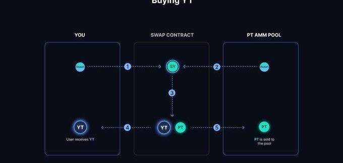 那么YT/PT的是如何定價和交易的呢?Pendle內置一個PT/SY的AMM,允許外部參與者提供流動性,用戶交易PT通過這個AMM交易即可。而交易YT則更為復雜: