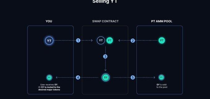 3.Pendle合并兩筆SY然后分拆XSY=XPT+XYT4.X個YT發送給用戶,而X個PT則歸還給AMM,由于XPT=(X-1)SY=XSY-XYT,池子總資產并不會出現變動用戶賣出YT過程就反過來了,參見下方兩張圖片即可。