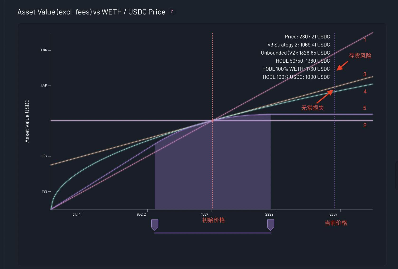 相對于v2而言無常損失仍然存在,而且更大;LP的權衡價格區間越大,所獲得的費用收益就越低,(0,+∞)時和v2一致。但如果選擇一個更小的價格區間,就會有更高的無常損失。無常損失分析