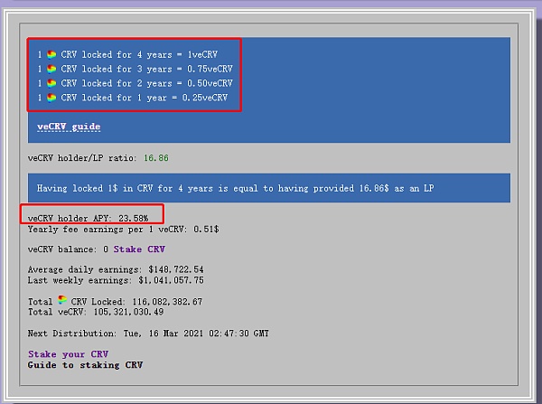 這里的Crv鎖倉獲得veCrv并不是一成不變的,未來的veCrv獲得會更加苛刻,目前是鎖倉Crv4年,可以1:1獲得veCRV;鎖倉3年的是1:0.75,也就是鎖10000個CRV3年,將會獲得7500個veCRV;以此類推看圖片中數據即可。