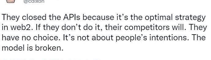 即使Twitter的前首席執行官JackDorsey承諾開放協議和長期中立性,在足夠長的時間范圍內,抗審查的Twitter的承諾總是會落空的——這是自然的博弈論結論。開放代碼和允許用戶擁有私人數據的概念,與建立在封閉協議上的公司的商業模式是根本對立的,這些公司依靠其終端用戶的數據來為其股東創造經濟回報。